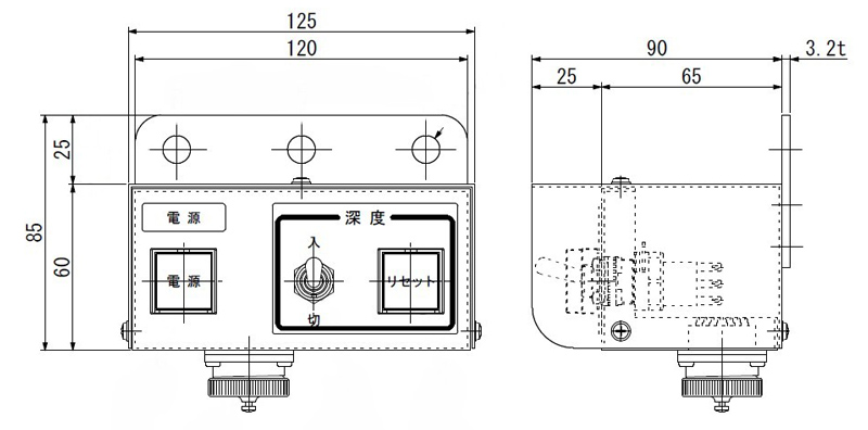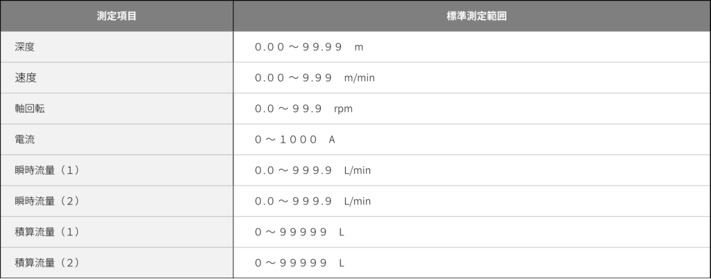 本装置は、軟弱地盤改良工法において、アースオーガの掘削深度・速度・回転数(2系統)・注入剤流量(2系統)及び、アースオーガ駆動電動機の電流をそれぞれ測定し、管理室(プラント表示器)及び、施工機運転席(重機表示器)にデジタル表示する計測装置です。尚、本装置は、弊社の施工管理装置等とデジタル接続ができます。