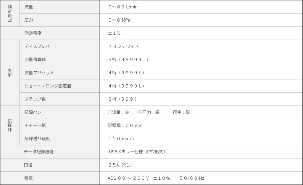 本装置は一般社団法人日本グラウト協会の仕様に基づき製造されたもので、各種薬液注入工事における施工時の「流量」と「圧力」をリアルタイムに表示し記録を行います。また、記録時のデータとして流量積算値と施工年月日等も併せて同一チャート上に印字されます。